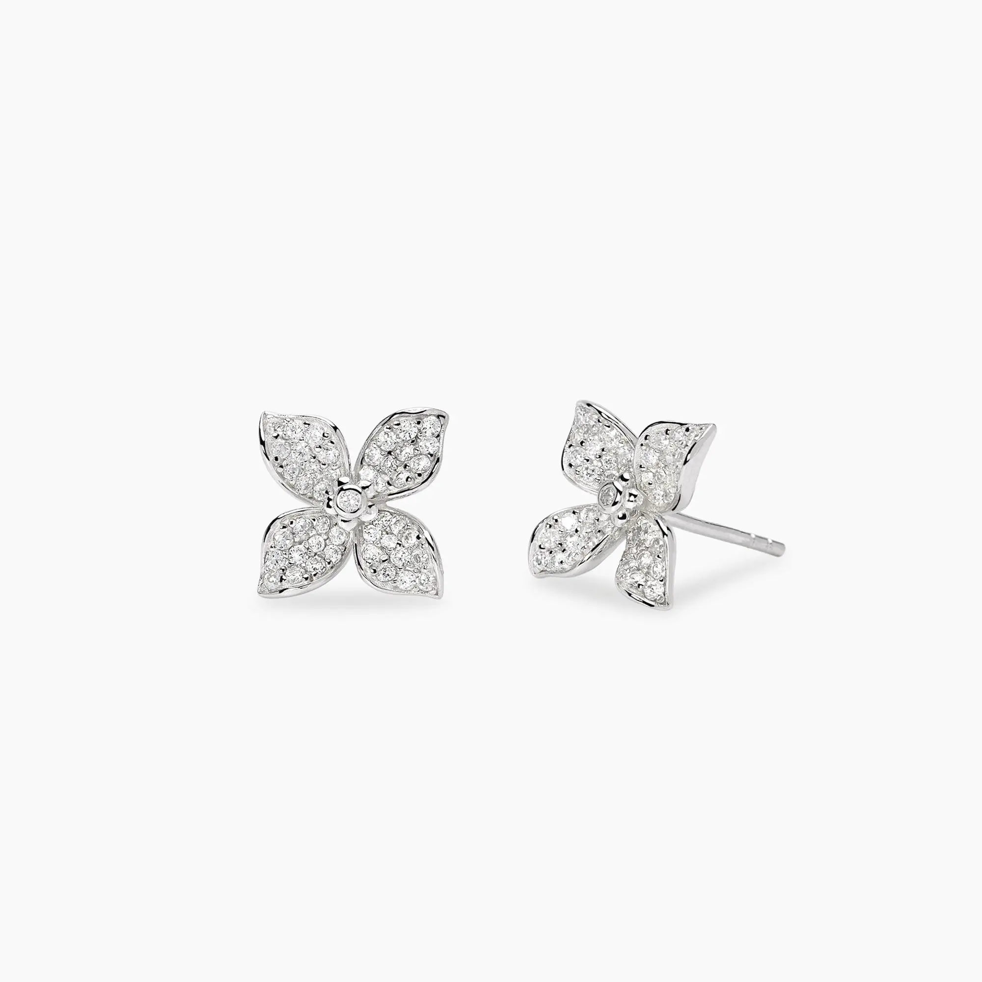 Orecchini in argento rodiato con fiore in zirconi bianchi.