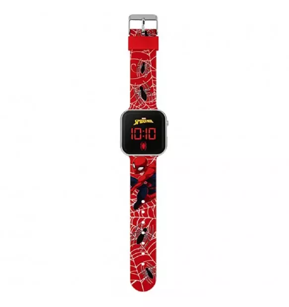 Cinturino in silicone rosso con fantasia Spiderman. Chiusura con fibbia ardiglione.