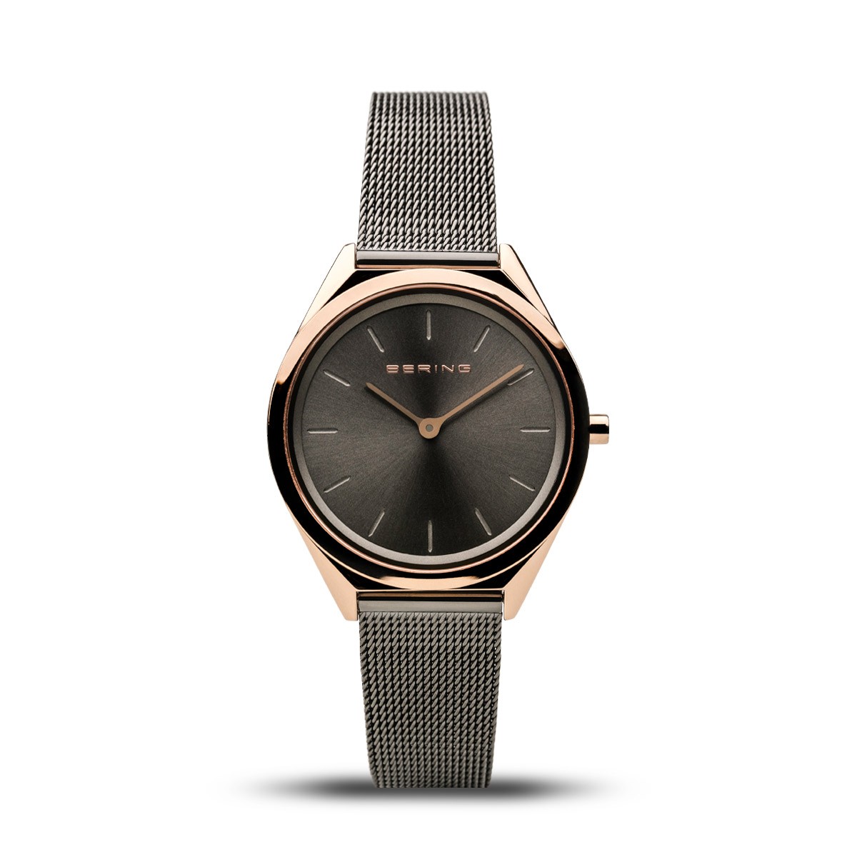 Orologio Solo Tempo Da Donna Di Bering Della Collezione Ultra Slim. Orologio Con Cassa In Acciaio Inox Di Colore Oro Rosa Con Finitura Brillante Di 37X31Mm E Spessore Di 5Mm. Il Quadrante È Di Colore Grigio Raggio Di Sole Con Vetro Piatto Di Zaffiro. Il Cinturino È In Maglia Milano Di Colore Grigio Con Lunghezza Di 180Mm E Larghezza Di 14Mm. Orologio Con Chiusura A Scatto. Orologio Con Movimento Al Quarzo. La Resistenza All’Acqua È Di 3 Atm. Peso: 38Gr.