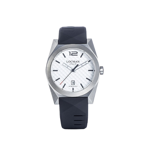 Orologio Solo Tempo Da Uomo Di Locman Della Collezione Nuovo Stealth. Orologio Con Cassa In Acciaio E Titanio Della Dimensione Di 41 Mm E Indici Stampati. Cinturino In Silicone Nero Della Larghezza Di 22Mm. Quadrante Colore Bianco Smaltato-Onde. Orologio Con Resistenza All’Acqua Di 5 Atm E Movimento Al Quarzo.