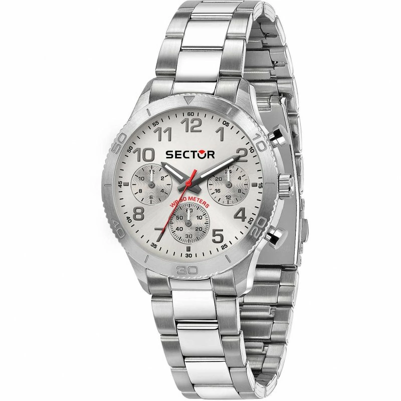 Orologio Sector da uomo della collezione 670. Il movimento dell’orologio è al quarzo con funzioni datario, indicazione del giorno della settimana. La cassa dal diametro di 37 mm è realizzata in acciaio con finitura spazzolata, con spessore di 10,2 mm. Il cinturino è in acciaio con chiusura Deployment con pulsanti. Il quadrante è di colore bianco con vetro minerale. La resistenza all’acqua è di 5 ATM / 50 metri.