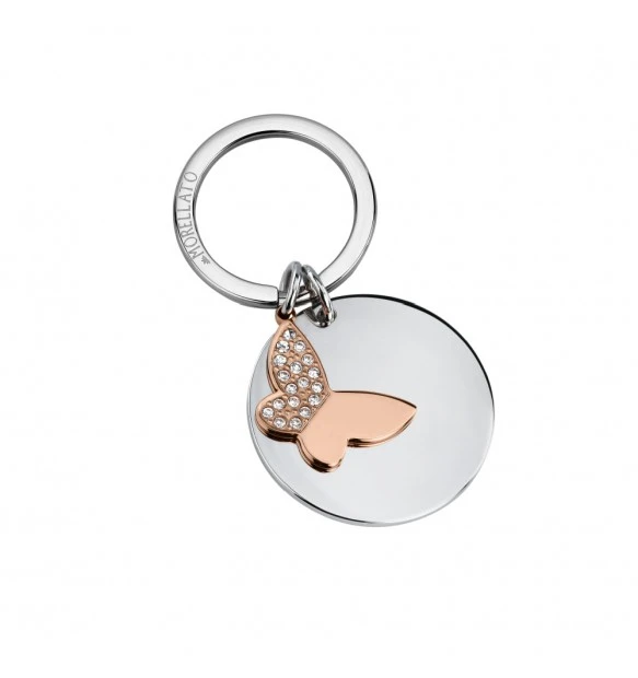 Portachiavi da donna realizzato in acciaio anallergico; pendente placcato oro rosa a forma di farfalla con cristalli bianchi; secondo pendente 3,4 cm con possibilità incisione.